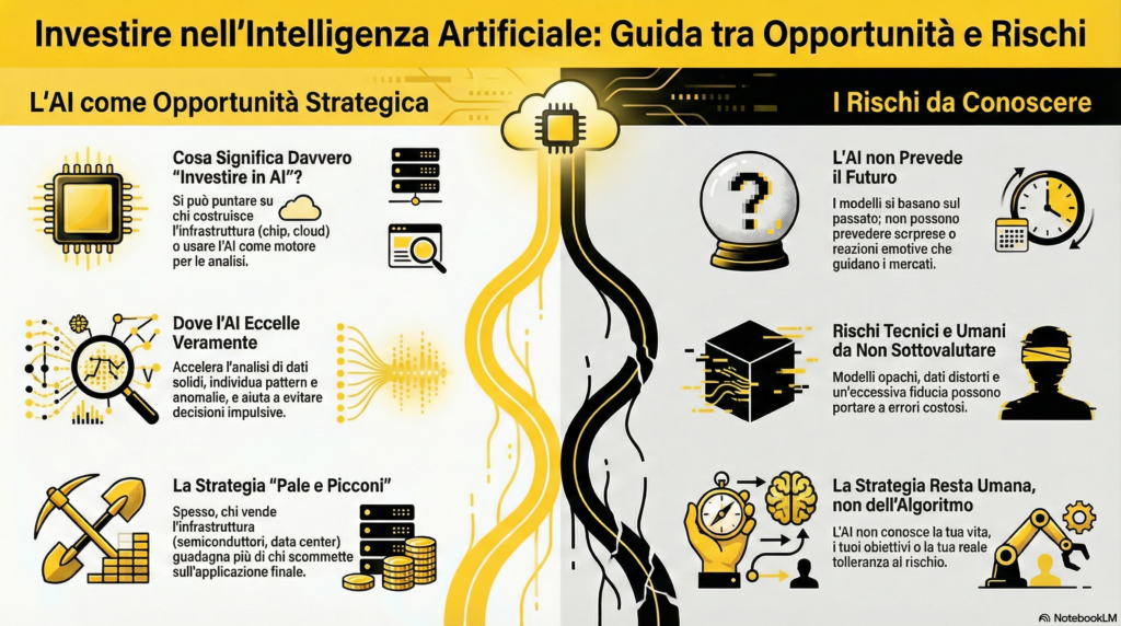 - La terza, la più delicata: ti affidi a un “consiglio” generato da un sistema che si presenta come intelligente. E qui la faccenda cambia, perché non compri un’azione o un ETF, compri una promessa. E le promesse, nel mondo degli investimenti, si pagano care quando non le controlli.